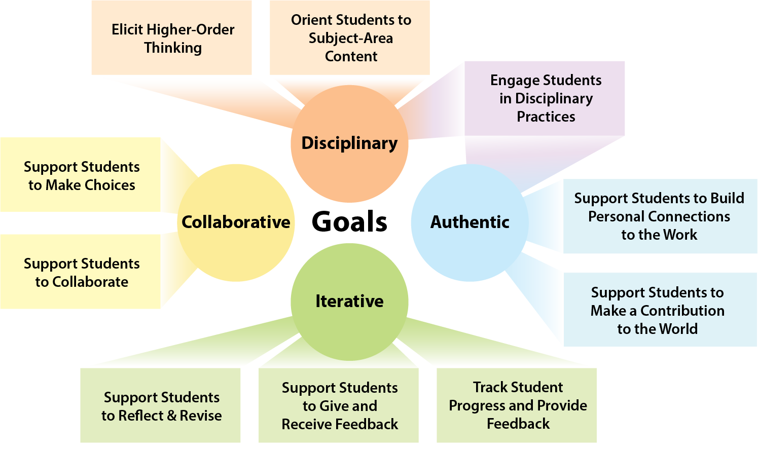 PBL has four key elements: disciplinary learning, authentic work, collaboration, and iteration (Grossman et al., 2019). These elements enable deep engagement with a topic over a sustained period of time. This diagram describes the necessary steps instructors should take to design robust PBL assignments. It is based on the work of Penn GSE—their resource on PBL has extensive information about each of these steps, including questions to ask yourself as you’re designing these types of assignments.